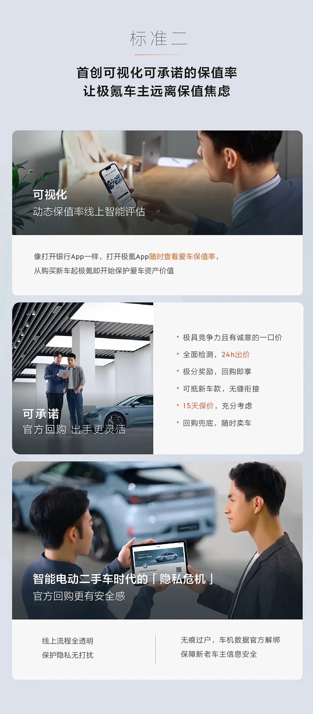 极氪官方回购为车辆保值率兜底,24小时出价、15天保价,全透明的线上流程,从源头保护隐私杜绝打扰,保障车主利益最大化。