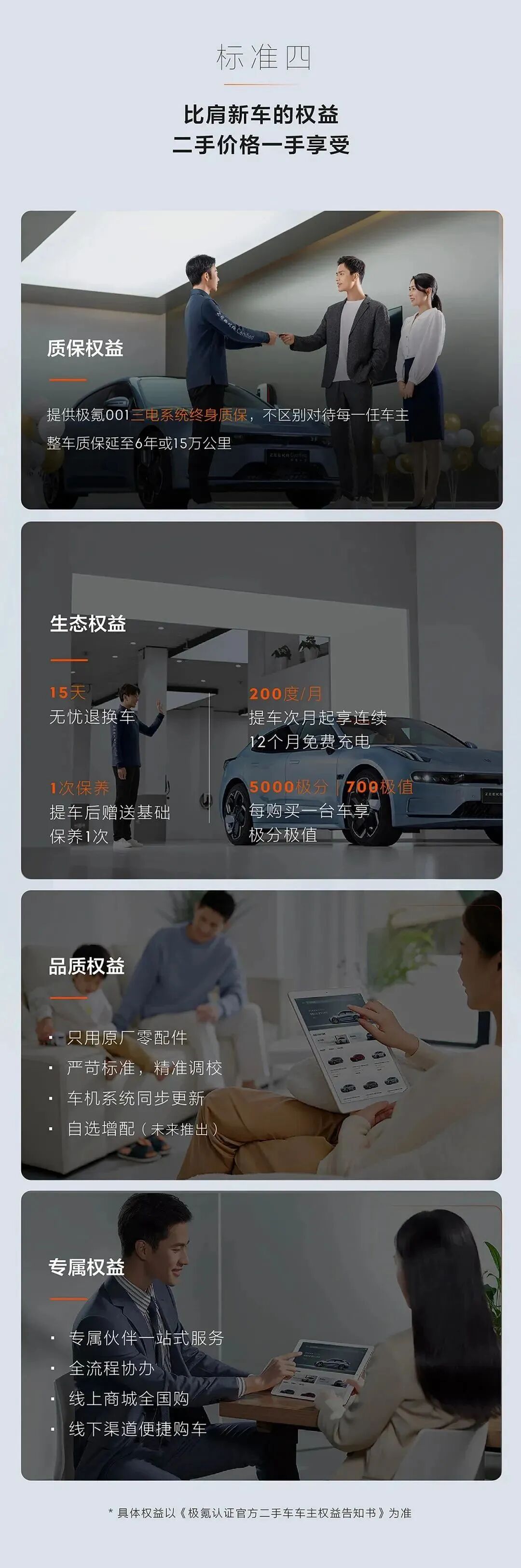 针对新能源二手车售后服务问题,极氪推出了行业最高标准的质保政策,包括三电终身质保、整车质保延至6年或15万公里,并可享受无忧充电、15天退换车等比肩新车的品质权益及服务。