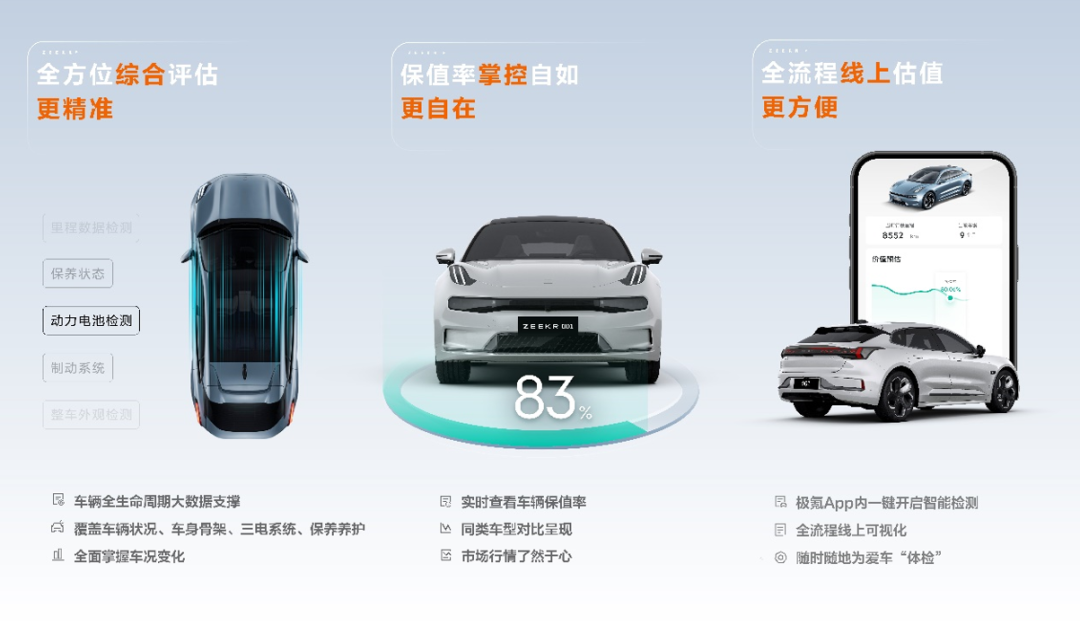 极氪自研检测工具创新推出360余项智能电动汽车专业检测标准,并依托大数据精准算法模型,自动生成可公开的三电综合状态评分、历史车况等级、整车综合车况评分。
