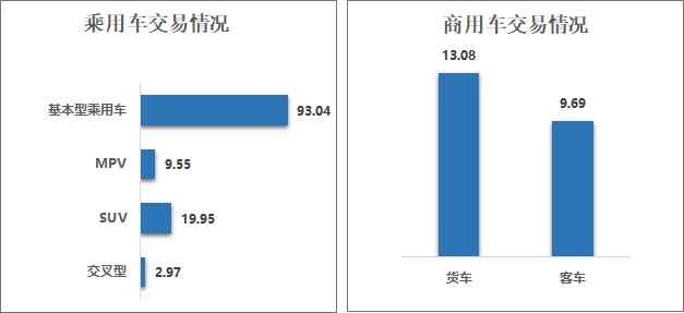 3月乘用车情况:基本型乘用车共交易93.04万辆,环比增长6.56%,同比增长19.93%;SUV共交易19.95万辆,环比增长7.25%,同比增长17.45%;MPV共交易9.55万辆,环比增长7.57%,同比增长18.43%;交叉型乘用车共交易2.97万辆,环比增长4.81%,同比下降4.08%。