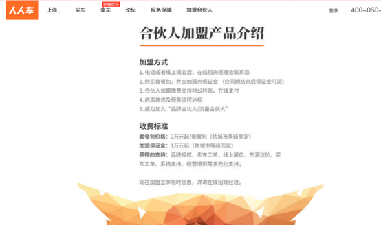 人人车的乱象还不止于此,由于与优信二手车、瓜子二手车等平台争夺市场份额,采取“合伙人”的加盟方式,没有直营店。