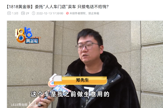 北京消委会在2022年发布文章,直指人人车涉嫌隐瞒车辆真实车况。消委会体验员在卖车体验中,联系“人人车”平台售卖一台二手车辆,平台派遣评估师进行实地车辆检测后,在该平台发布了该车售卖信息。体验员明确告诉“人人车”工作人员其所卖车辆为二手车辆后,平台却仍将过户次数写为0 。