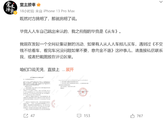 堂主并没有因此退缩,而是继续发了一条微博,表示自己不能背上这个污名,要人人车求锤得锤。并在全网发起征集活动,看看有没有消费者遇到同样情况,证明自己并不是个例,没有冤枉人人车。