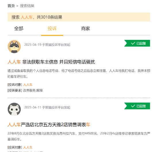 缸哥在新浪旗下消费者服务平台搜索发现,人人车投诉案件已经达到3010单,优信二手车投诉达到3001单。并且,绝大部分投诉指向虚假宣传。