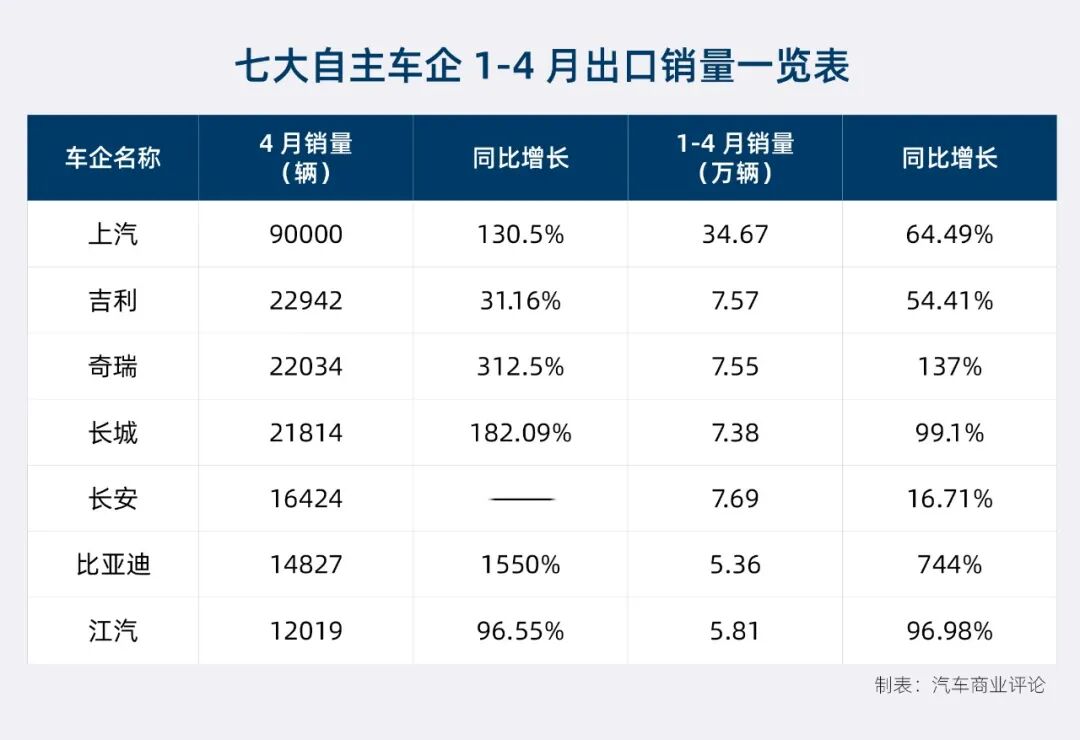 汽车海外零售销量名列前茅的中国自主企业,包括上汽集团、奇瑞集团、吉利集团、长城汽车、长安汽车、比亚迪和江汽集团,这七家公司在4月出口销量均突破了1万辆,1-4月出口销量都超过了5万辆。
