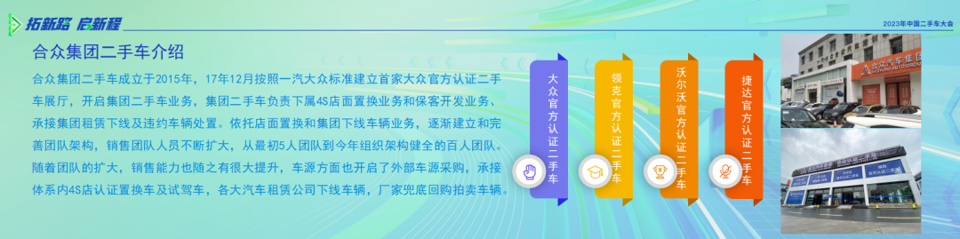 合众集团二手车公司成立于2015年,17年12月按照一汽大众标准建立首家官方认证二手车展厅,开启集团二手车业务,集团二手车负责下属4S店面置换业务和保客开发业务、承接集团租赁下线车辆处置。