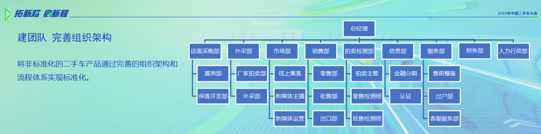 依托店面置换和集团下线车辆业务,逐渐建立和完善团队架构,销售团队人员不断扩大,从最初5人团队到目前组织架构健全的百人团队。