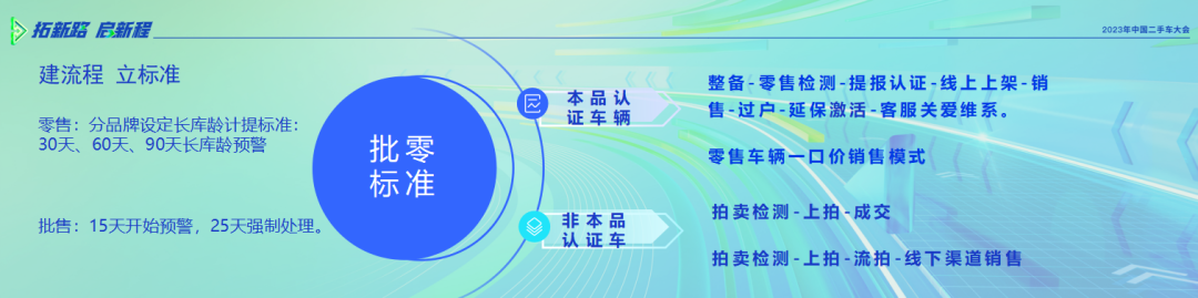 建流程 立标准:设立零售批售标准,批售车辆统一线上拍卖销售。零售车辆通过整备认证进行C端销售。