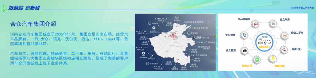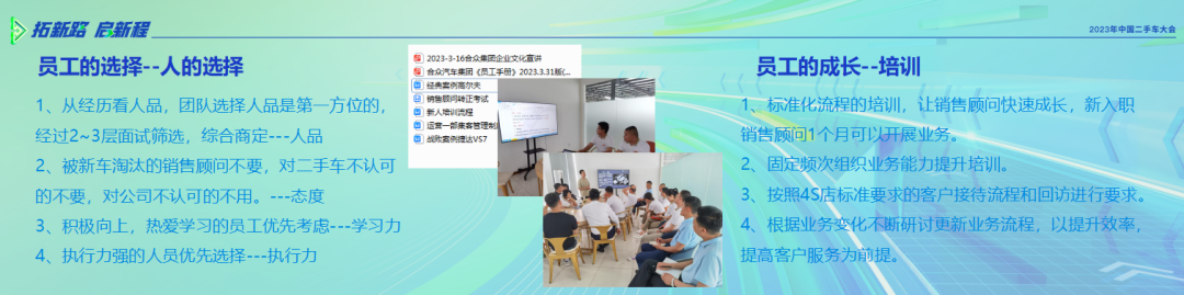 通过几年的发展,合众二手车已经建立了一整套完善的内部流程体系,2023年,面对新车的不景气和持续亏损,二手车业务也成了各个4S店的救命稻草,集团二手车通过批量优质二手车车源的采购,开始赋能店面,为店面提供二手车车源,提供人员培训,帮助店面卖好二手车。