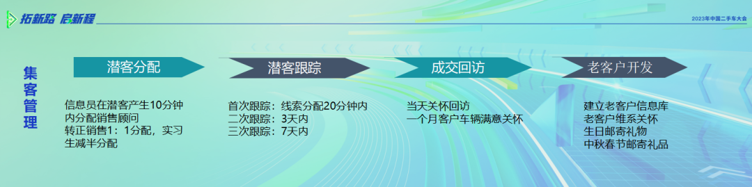 集客管理方面从集客下发,跟踪,成交或战败都通过系统有严格要求,并有专人检查。对于成交率过低的销售顾问会进行一对一辅导(产品知识,话术,客户需求分析等)。