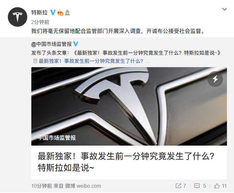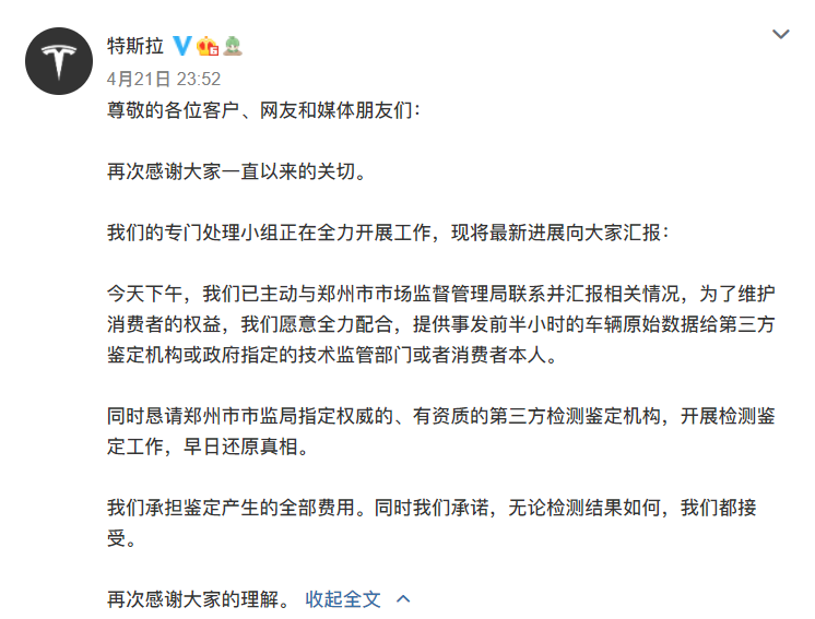 4月21日晚间,特斯拉在其官方微博上发文称:“愿意提供事发前半小时的车辆原始数据给第三方鉴定机构或政府指定的技术监管部门或者消费者本人,开展检测鉴定工作,早日还原真相。”