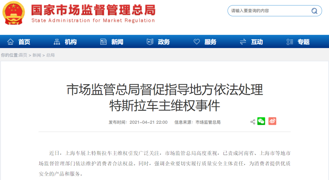 同日,国家市场监督管理总局发布公告称,已责成河南省、上海市等地市场监督管理部门依法维护消费者合法权益。