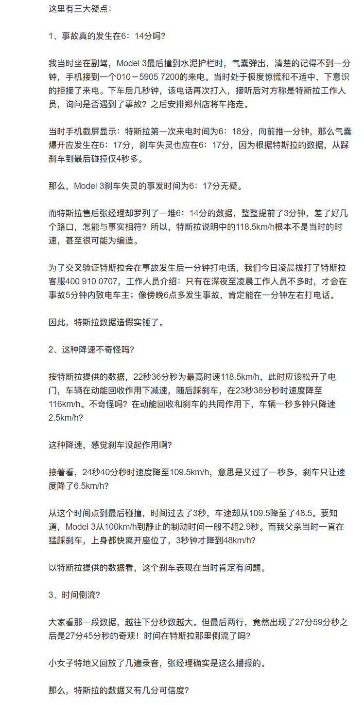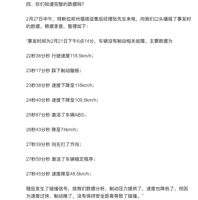 不过,此前维权车主在微博上表示,当时行驶的路况下根本不可能将车辆开到100km的时速。另外,车主也在微博上贴出了此前特斯拉单方面提供的数据,并对其数据提出质疑。
