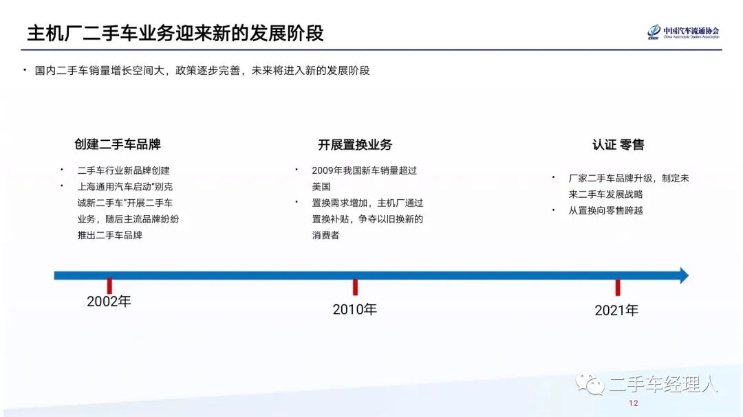 第一阶段,2002年上汽通用创建诚新二手车,随后主流品牌纷纷推出二手车品牌,这个阶段是品牌建立阶段,汽车厂商进入二手车行业并进行营销宣传。