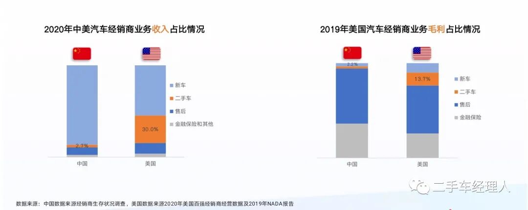 从收入结构看,美国经销商二手车收入占比达30%,而我国经销商的二手车收入占比只有2.7%。