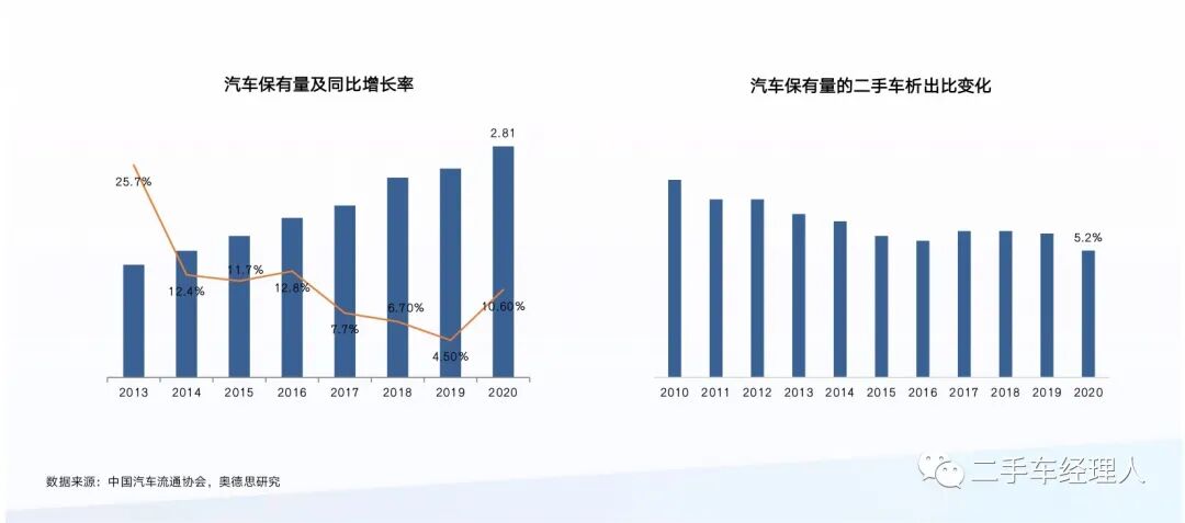 2013年,我国汽车保有量已经超过1个亿,且连续多年以10%以上的速度持续上涨,2020年,我国汽车保有量已达2.81亿,居于世界首位。2010年,我国二手车析出率为8.1%。