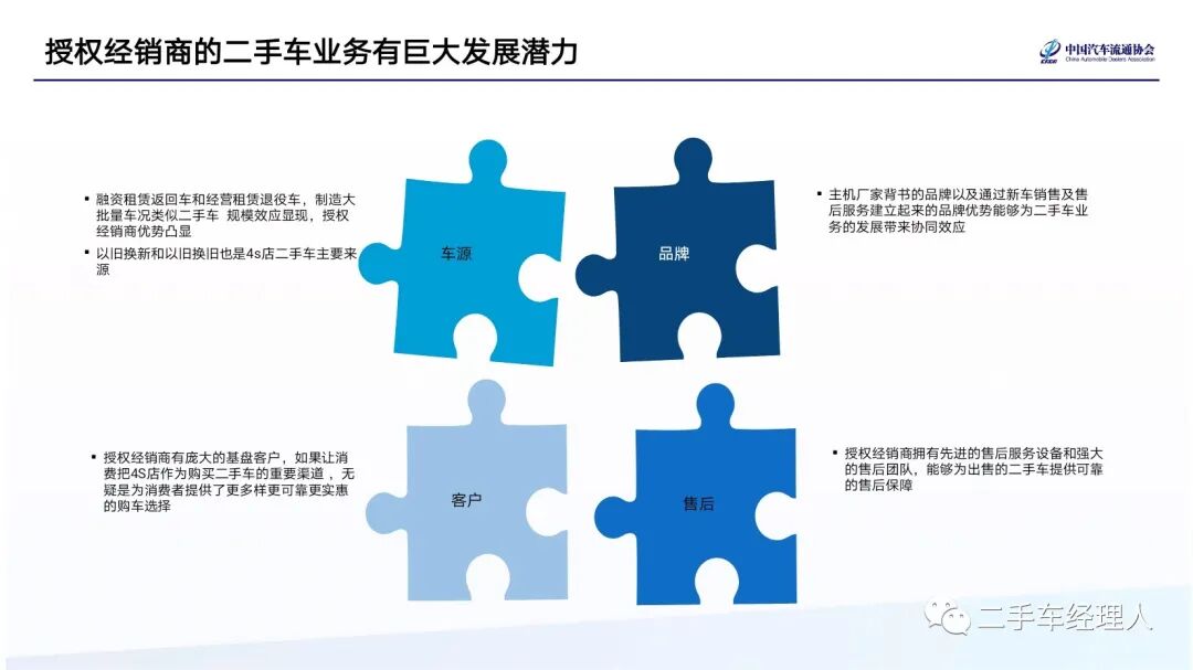 品牌优势:授权经销商的二手车业务有主机厂家品牌的背书,还可以拉动一系列精品和售后服务。