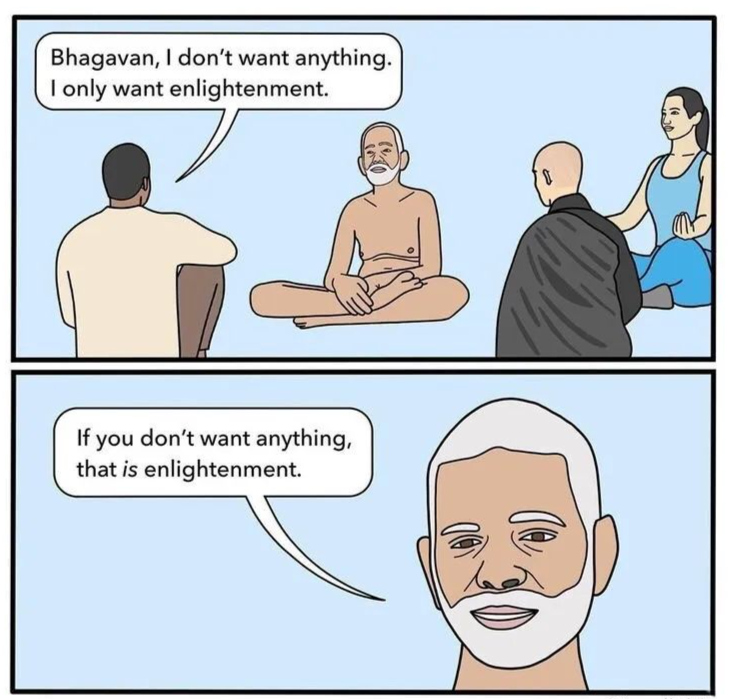 就像《薄伽梵歌》说在修行的道路上,对修行者而言,睡眠是所有修行的第一障碍。第二障碍,据说是世上感官之物,能转移我们的注意。第三障碍,是念头,对感官之物的前所体验而萦怀不去。第四是幸福感,也被认为是障碍。因为在那境地,是一种从福祉的源头分离出的感知,使人顿时说:「我现在好幸福。」其实,这时候更应该越过此境,迈抵三摩地的最终阶段,在那里人成为幸福,或与真实合一,使「享受者与享受之事实」的二元对立,全然消泯于存在、意识、福祉,或那个真我的汪洋之中。