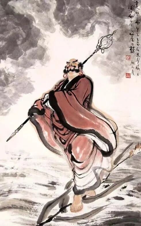 达摩见与梁武帝话不投机,便不愿久留。他来到长江岸边,看到江水苍茫,没有渡舟,便寻得一根苇草,放入江水中,双脚踏上,苇草载人,凭风借势,须臾之间,达摩渡过了长江,前往北方。