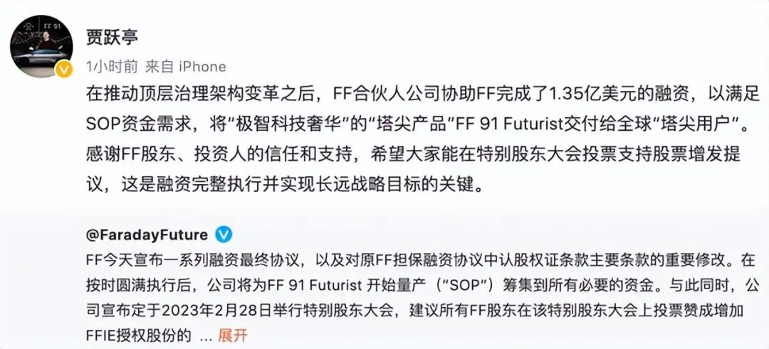 而增发需要召开股东大会,需要股东的同意,所以FF计划于2023年2月28日举行特别股东大会,所以就有了贾跃亭发文希望大家投票赞成增加FFIE授权股份的提议。