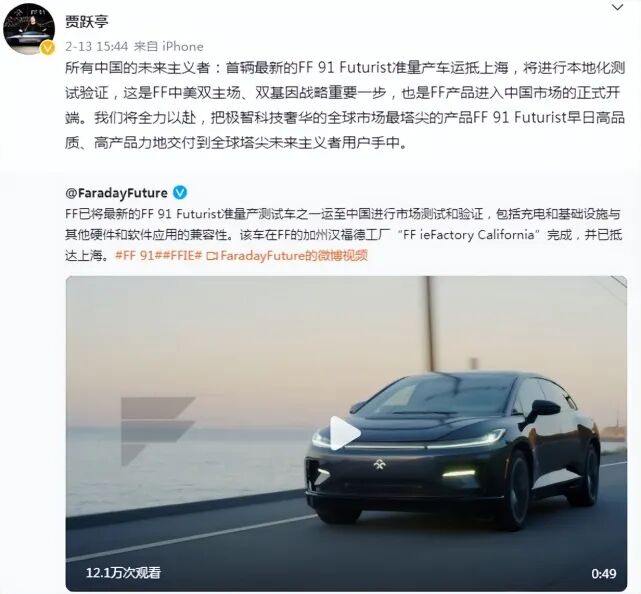 而为了交付这台车,贾跃亭将FF91的测试车都拉回了上海,在国内也进行测试,实现美国、中国双主场、双基因的战略,毕竟之前有报道,FF法拉第与湖北黄岗签约了的,FF中国总部可以是设在湖北黄岗的。