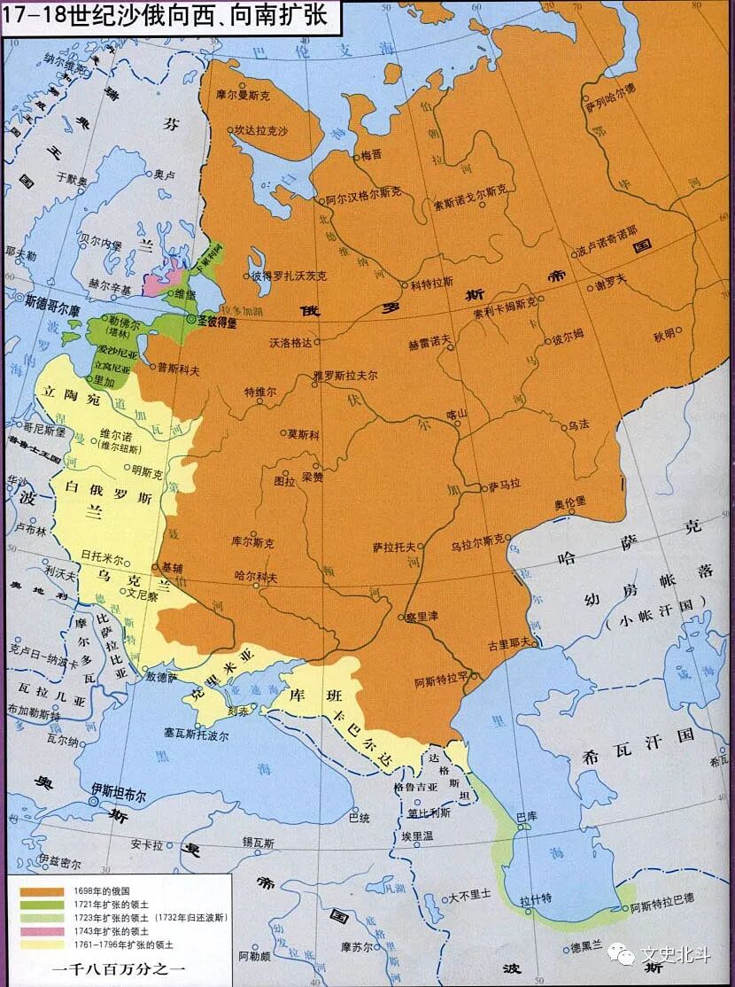 在叶卡捷琳娜时代,俄罗斯帝国的国力达到了巅峰。她发动了两次俄土战争,吞并了克里木汗国,夺得了黑海的出海口;三次参与瓜分波兰,俄国得到了波兰62%的土地;晚年又击败了瑞典,保证了俄国在芬兰等地的权益。法国大革命爆发后,她又就入了反法同盟,镇压欧洲的民主革命,使得俄国称霸西欧,成为“欧洲宪兵”。除了在欧洲称霸之外,叶卡捷琳娜还想成为世界霸主。她将俄国的侵略势力伸向了埃及、波斯和美洲,妄图建立6个都城的俄罗斯帝国。她说“要是我能够活上200年,整个欧洲必将至于俄国统治之下。”结语