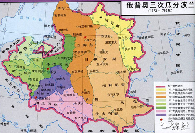 到了18世纪,波兰周边的俄罗斯、普鲁士、奥地利都非常强盛,自己成为了被瓜分的对象。1772年,俄、普、奥三国第一次瓜分波兰,波兰损失了21万平方公里土地;1793年,俄国和普鲁士第二次瓜分波兰,这次波兰损失了30万平方公里土地,其中立陶宛被俄罗斯吞并;1795年,三国完全瓜分了波兰。从此,至此波兰—立陶宛王国彻底灭亡。