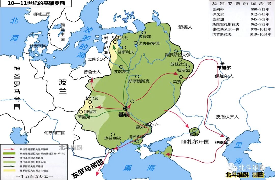 此后,留里克王朝不断向南扩张。为什么要向南扩张呢?目的是控制商路。东欧平原有第聂伯河(被称为罗斯河)、伏尔加河等深入欧洲大陆的河流。如果地理上可以看到,东欧平原也是连接黑海和波罗的海的通道。古代的波罗的海沿岸的国家会通过这些大型的河流将货物运输到黑海,和东罗马帝国进行贸易。