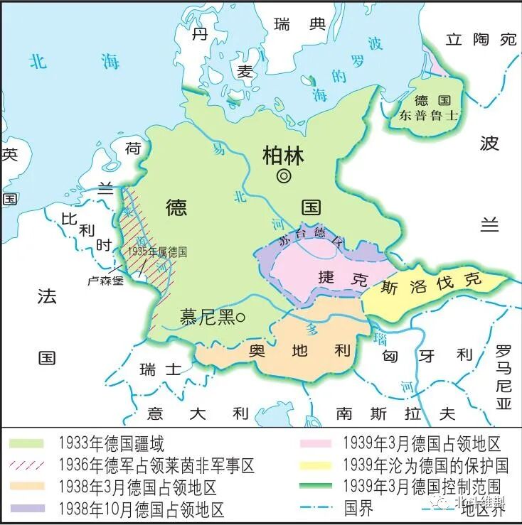 巴黎和会之后,欧洲形成了英法主导的凡尔赛体系。由于对战败国过分削弱,体系产生了不稳定的因素。1929年,西方世界爆发了规模空前的经济危机,德国更是深陷危机泥潭。此后,德国走上了法西斯道路,开始了对外扩张,兼并了捷克、斯洛伐克、奥地利等地区。1938年,德国虚伪地和英法意签订了《慕尼黑协定》。