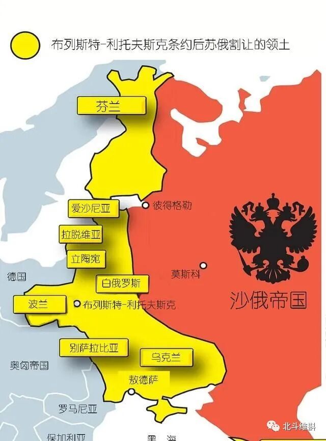 1918年3月,俄国和德意志、奥匈帝国、奥斯曼帝国、保加利亚王国等签订了《布列斯特条约》。在该条约中,俄国答应放弃对波兰、立陶宛、库尔兰、利夫兰和爱斯特兰(属于芬兰),承认乌克兰、芬兰独立,并向德国赔偿60亿马克的巨款。通过这个条约,俄国的土地面积减少了323万平方公里。