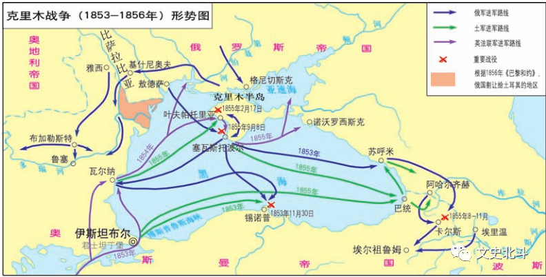 土耳其不甘失败,又挑起了第六次(1787~1792年)、第七次(1806~1812年)、第八次(1828~1829年)三次俄土战争。随后,英法联军开始干涉战争。1853年,俄国为了夺取拜占庭,称霸地中海,发动了第九次俄土战争。英法两国认为俄国的急剧扩张损害了自己在地中海的利益,于是就联合土耳其对俄国作战。最终,俄国被击败。此次战争又称为“克里米亚战争”。克里米亚战争让俄国称霸地中海的梦想破灭,但是俄国并未失去克里米亚。战争失败后,俄国进行了农奴制改革,推动了俄国社会的进步。后来俄国又对土耳其发动了几次战争,但是其目的已经不是为了保护克里米亚,而是为了吞并土耳其。