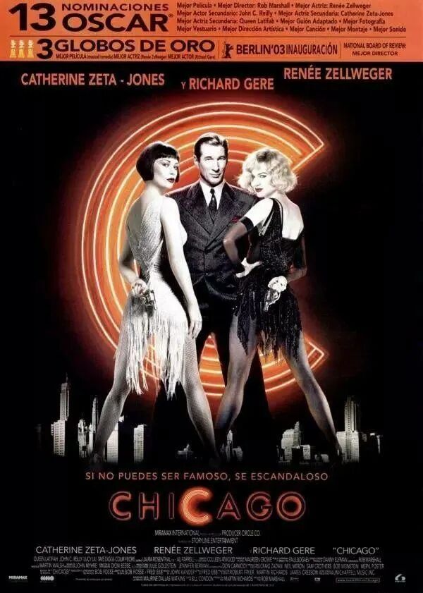 《芝加哥》是改编自同名百老汇剧的音乐歌舞片,由罗伯·马歇尔执导,蕾妮·齐薇格、凯瑟琳·泽塔-琼斯、理查·基尔、约翰·C·赖利等主演,影片于2002年12月10日在美国上映。影片讲述的是两起发生在芝加哥的案件,经过律师比利炒作后声名大噪的故事,将二十世纪二十年代的芝加哥不择手段求出名的世态演绎的淋漓尽致。