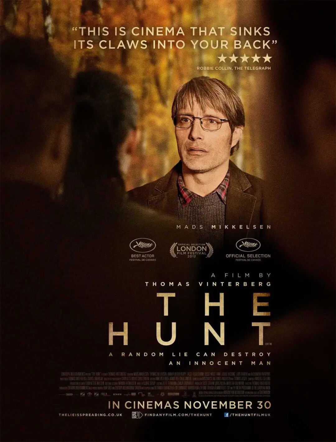 《狩猎》是托马斯·温特伯格执导,麦德斯·米科尔森、托玛斯·博·拉森主演的丹麦电影。影片用一个关于绯闻、谎言、仇恨和怀疑的传闻毁掉一个男人生活的故事,讲述了谎言变成“事实”的过程,向我们揭示了众口铄金的的含义。