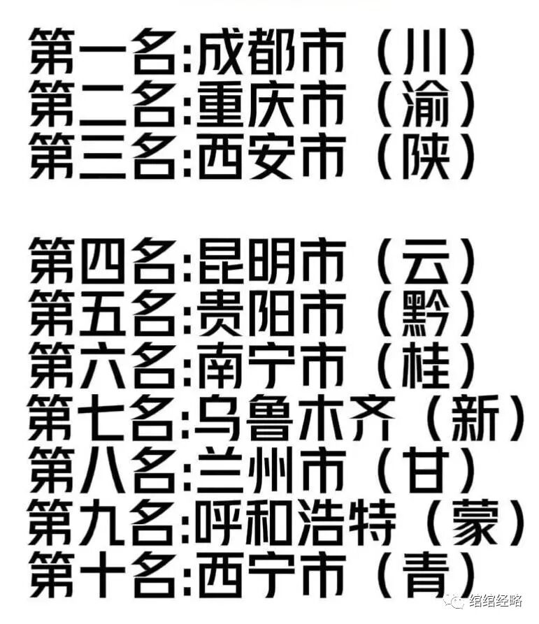 有网友整理了西部地区综合实力十强市榜单,认为在西部地区最强的十个城市分别为成都市、重庆市、西安市、昆明市、贵阳市、南宁市、乌鲁木齐市、兰州市、呼和浩特市和西宁市。