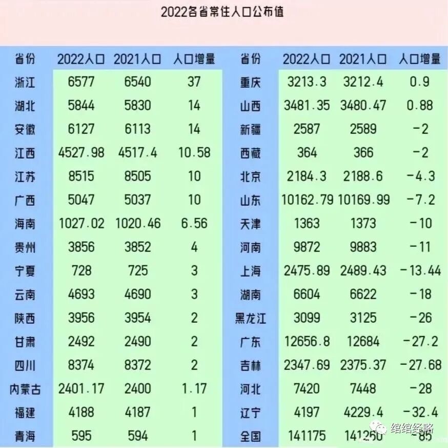 中国各省人口增加数量已经出炉,有的增长了,有的负增长。2022中国人口增量的完整榜单如下图所示,你的家乡增长了吗?