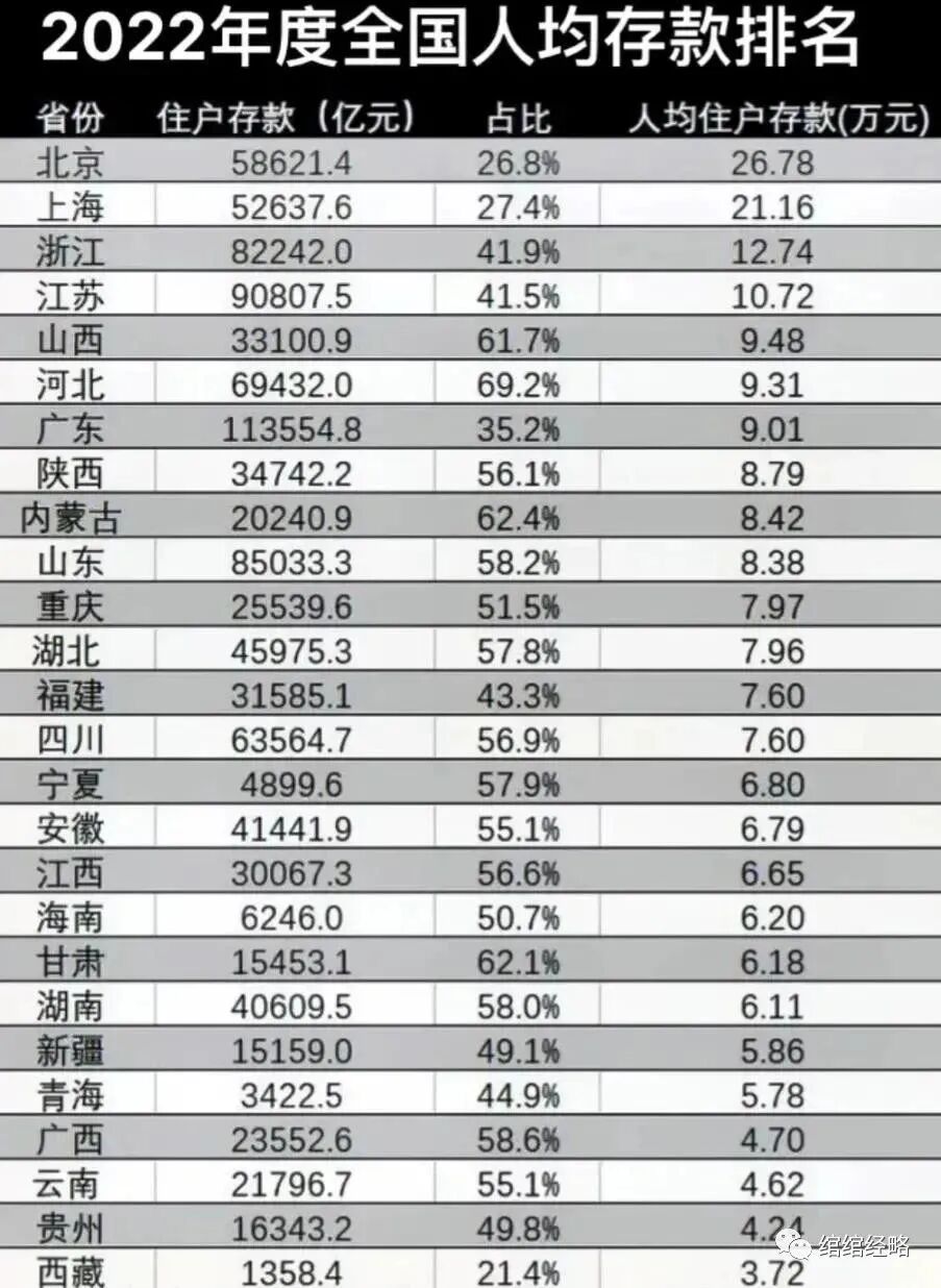 中国各省市区人均存款排名出炉,排名前五的省份分别是北京(26.78万元)、上海(21.16万元)、浙江(12.74万元)、江苏(10.72万元)、山西(9.48万元)。你的家乡排名第几?