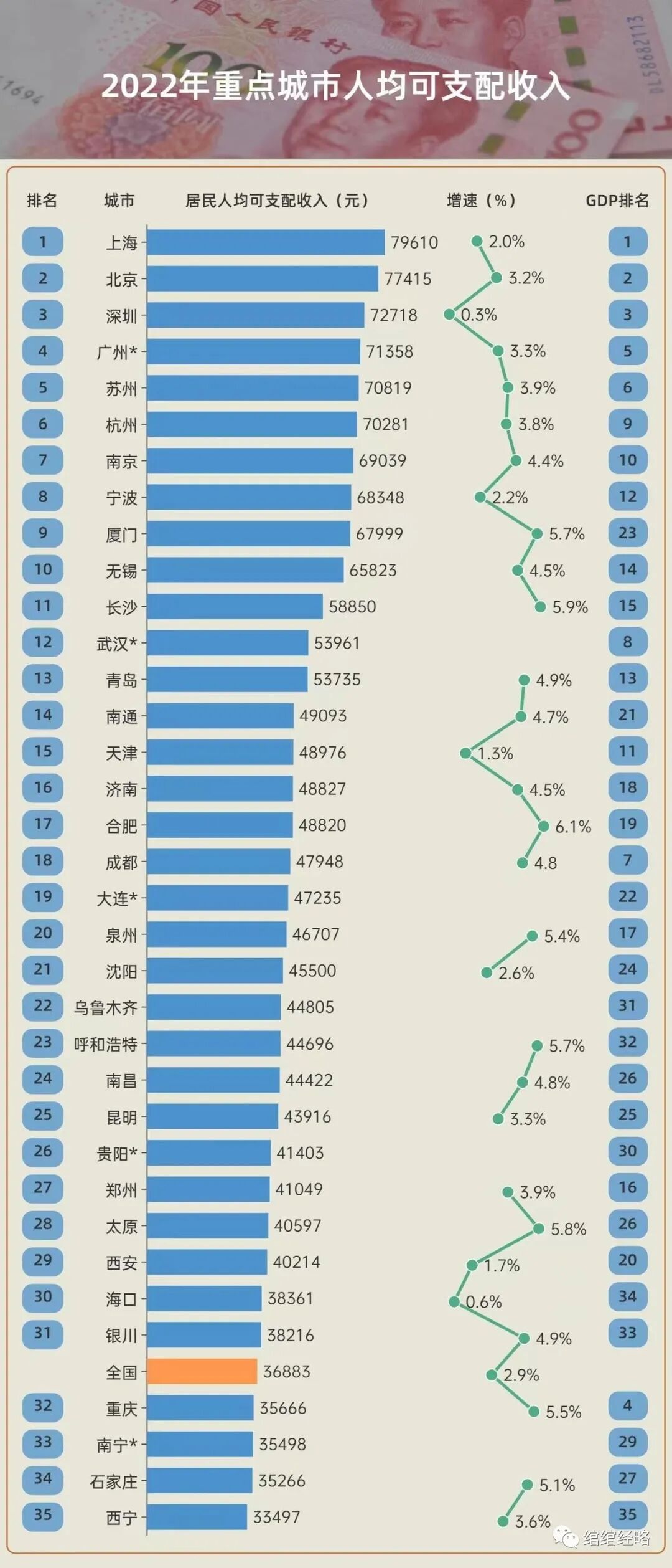 根据公布的2022年重点城市人均可支配收入,对重点城市进行了排名。数据显示,上海以79610元的人均可支配收入稳居第一,成为中国收入最高的城市。而天津则被无锡反超,排名下降至15。此外,数据还显示,东北地区的城市人均收入高于西北地区的城市,重庆GDP排名第4,人均可支配收入则跌至倒数第4。