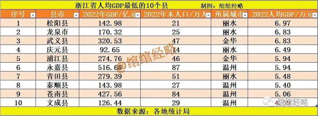 浙江省是我国东部地区的沿海省份,以其靠海的优势和独特的商业文化成为了我国最发达的省份之一。从自然环境方面来看,浙江省并不占优势,拥有很多的山地和丘陵地区,只有浙北地区有一部分平原。虽然地形条件不好,但是浙江省仍然走在了发展的前列,这与浙江省发达的县域经济是分不开的。在中国“民富”50强县榜单中,浙江省甚至占据了榜单的60%,这在全国都是绝无仅有的。但是,浙江省也有发展落后的县。本文根据2022年浙江省各县人均GDP进行排名,整理出了浙江省人均GDP最低的10个县,分别为松阳县(6.97万元)、龙泉市(6.83万元)、武义县(6.83万元)、庆元县(6.49万元)、浦江县(5.94万元)、永嘉县(5.94万元)、青田县(5.48万元)、泰顺县(5.40万元)、苍南县(5.06万元)、文成县(4.39万元)。这10个县的人均GDP跨度较大,最高的松阳县已经接近7万余元,不算低了,但是最低的文成县只有4.39万元,却又较低。从人口看,除了永嘉县和苍南县是人口大县之外,其余县市人口也不算多。
