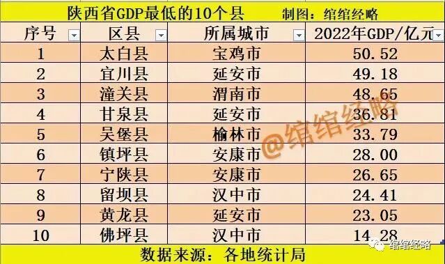 根据2022年陕西省各区县GDP排名,本文整理了陕西省GDP最低的10个县,分别为太白县(50.52亿)、宜川县(49.18亿)、潼关县(48.65亿)、甘泉县(36.81亿)、吴堡县(33.79亿)、镇坪县(28.00亿)、宁陕县(26.65亿)、留坝县(24.41亿)、黄龙县(23.05亿)、佛坪县(14.28亿)。这十个县的GDP最高的才突破50亿元,而最低的不到15亿元,在整个中西部地区也算比较低了,可以说是陕西省落后的十个县。