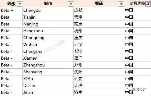 在最新的《世界城市名册》榜单中,中国共有13个城市上榜世界二线城市榜单,并且该榜单还把世界二线城市分为三个级别,分别是强二线(Beta+)、准二线(Beta)和弱二线(Beta-)。