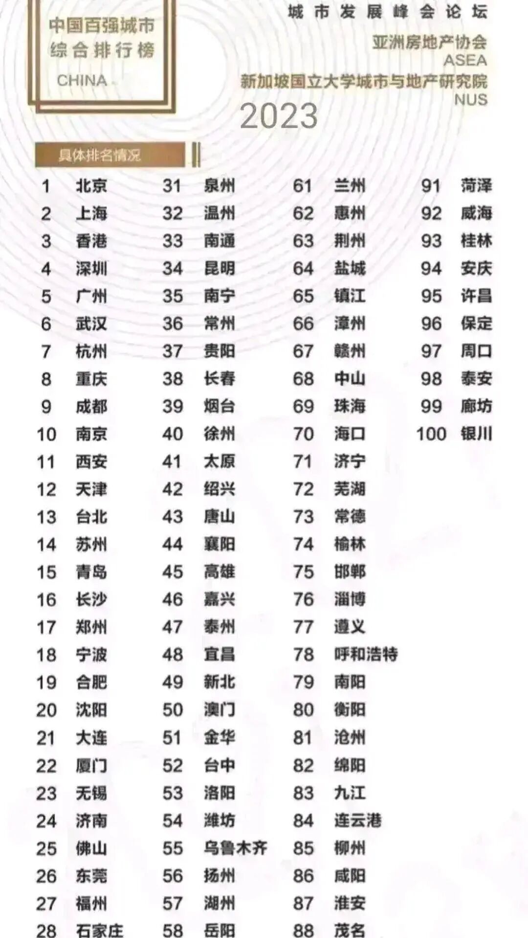 由亚洲房地产协会(ASEA)和新加坡国立大学城市与地产研究院(NUS)在城市发展峰会论坛发布的《中国百强城市综合排行榜》2023年版本已经更新,该榜单每年更新一次,参考指标不详。