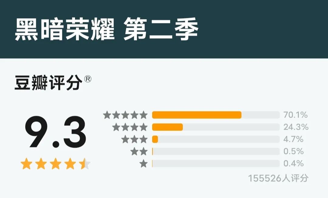 国内网友对《黑暗荣耀》并不陌生,第一季就以极度冷酷交织着热血复仇的精彩故事,以及宋慧乔、林智妍彗星撞地球般的演技对决,赢得了好评如潮,到了第二季更是火爆加倍,豆瓣评分高达9.3分,足以说明剧迷的喜爱程度。