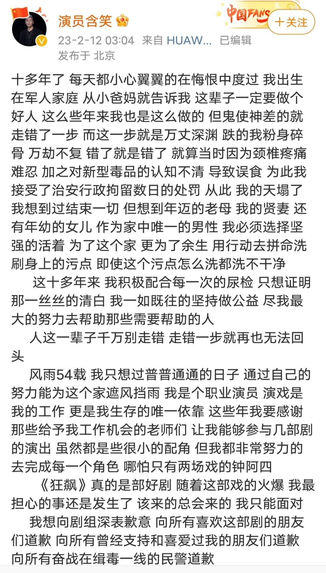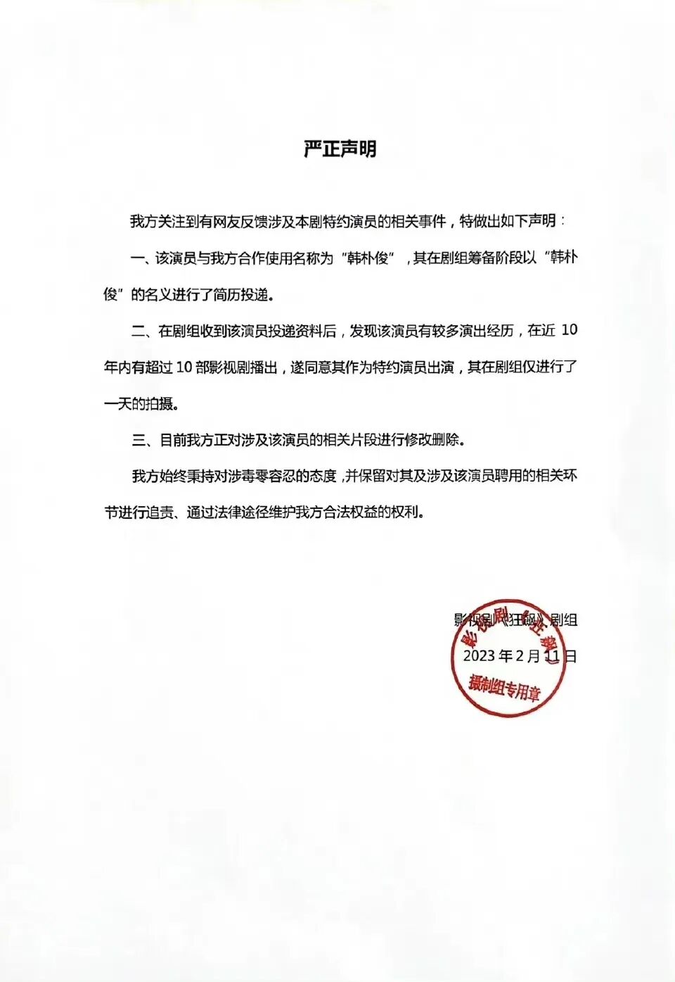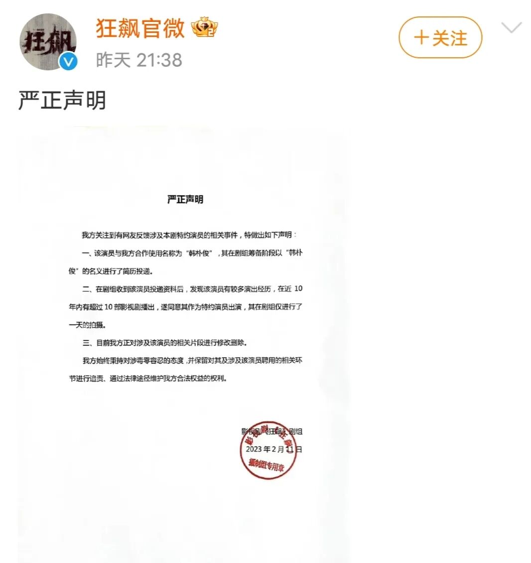 这么多年隐姓埋名,依然活跃在荧屏上,看到这份履历,也不由令人联想到《潜伏》中的盛乡,一失足成千古恨,要怪只能怪自己确实犯下大错,出来吸总是要还的。现在《狂飙》也发声明,表示正在删除含笑的戏份,并解释说当时剧组招募演员时得到的是“韩朴俊”的简历,并不知道他就是含笑。