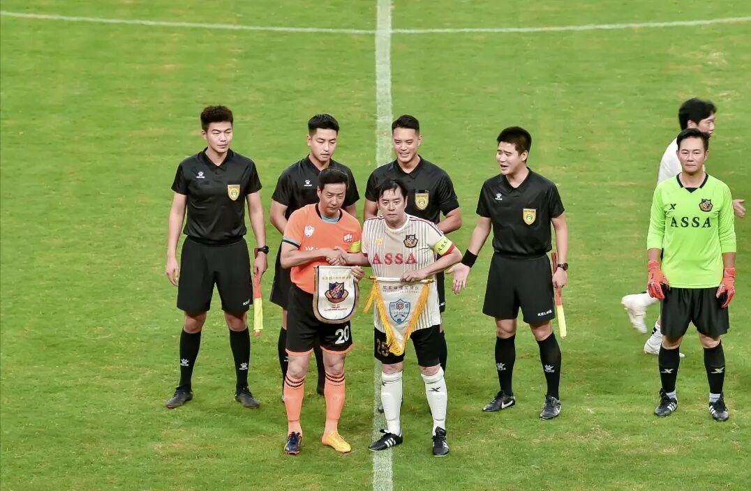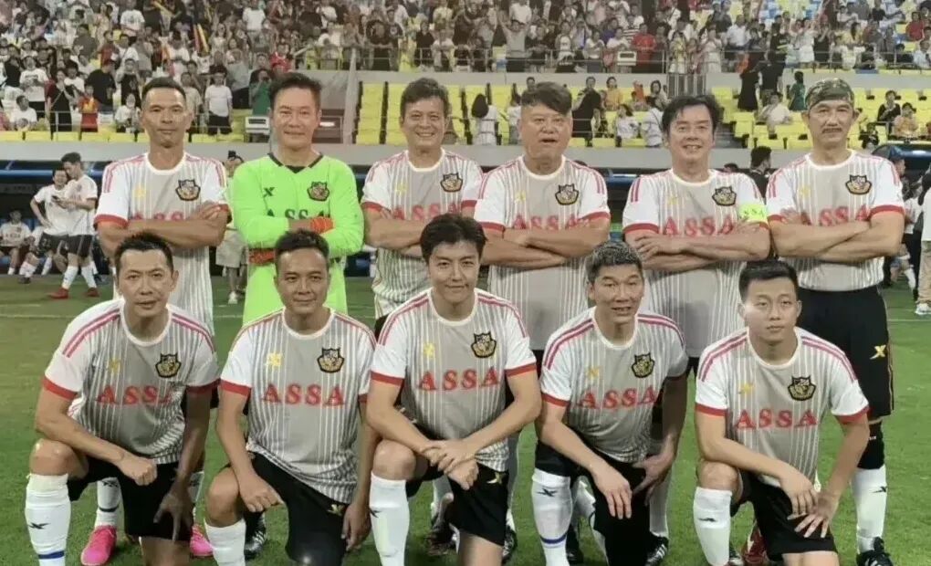 因为场上远道而来的客场球员,都不在青壮之年,而是比大湾区的哥哥还要大上一辈的老牌明星,队长陈百祥和谭咏麟都已经73岁了,关礼杰61岁,李子雄64岁,黄日华61岁,完全是一支60加的“爷爷队”。