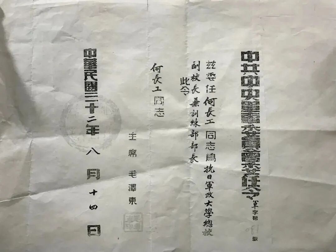 1943年8月14日,中共中央军事委员会任命何长工同志为抗大总校副校长委任状