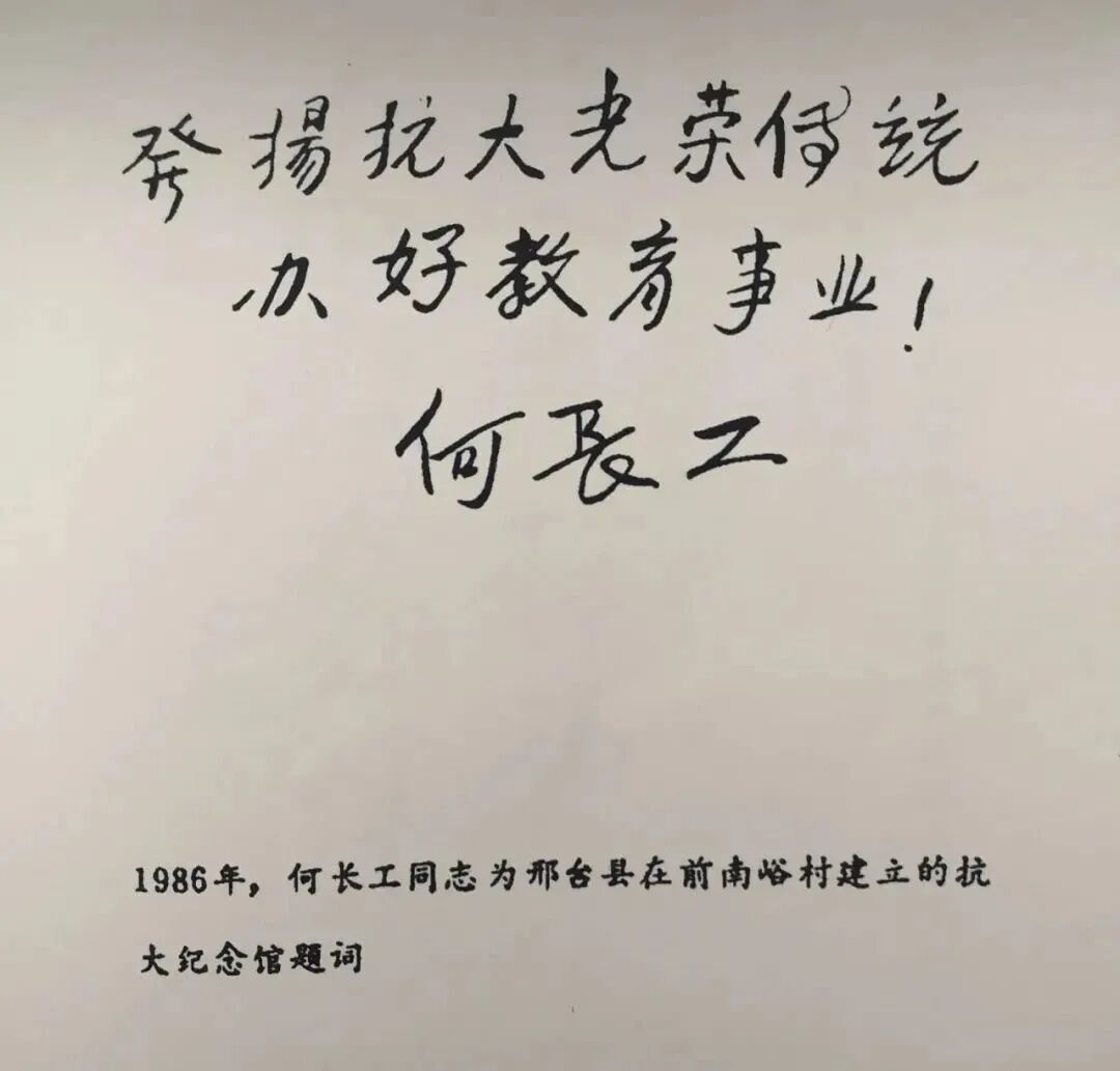 1986年,何长工同志为邢台县(今信都区)在前南峪村建立的抗大纪念馆题词
