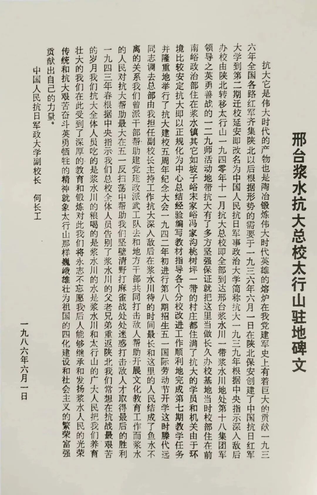 太行山的战斗岁月,在何长工的心中留下了永生难忘的印象。1986年6月1日,纪念抗大成立五十周年之际,中央军委和中共河北省委、河北省人民政府在浆水抗大总校驻地前南峪村建造了全国唯一一座抗大纪念碑,何长工满怀热情,撰写了碑文。何长工对于浆水感情非常深厚,碑文中,何校长这样说道:“我们常想在抗战最艰苦的岁月,我们抗大全体人员吃的是浆水川的粮,喝的是浆水川的水,是浆水川和太行山的广大人民把我们养育壮大的。我们在此受到了深厚的教育和锻炼,对此我们将永志不忘。”