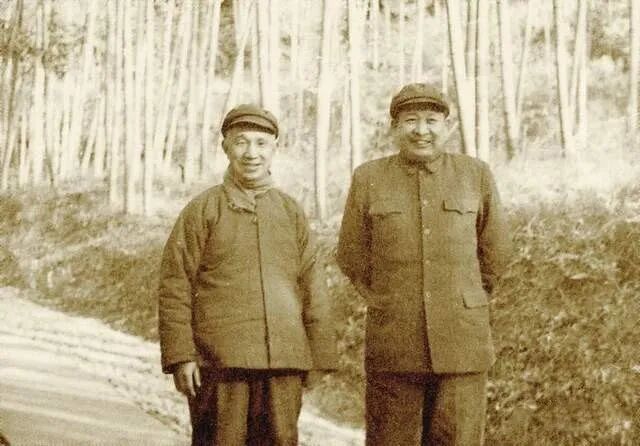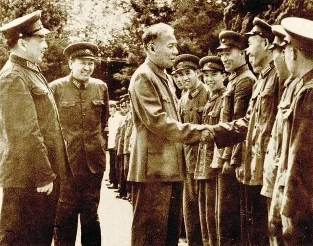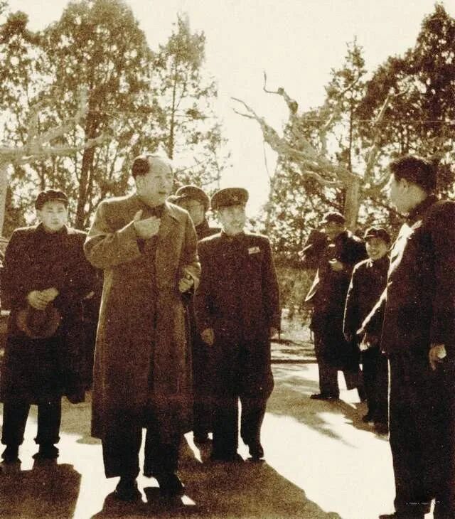1956年毛泽东视察南京军事学院。右起:钟期光、谭震林、陈伯钧、刘伯承、毛泽东、李银桥。