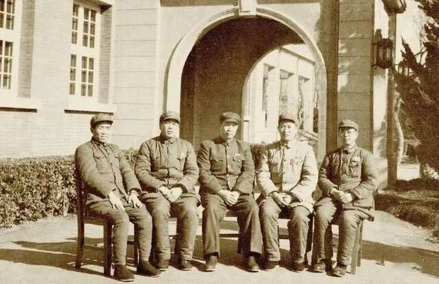 1950年春在华东军事政治大学。左起:聂凤智、余立金、陈士榘、钟期光、张崇文。