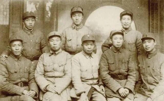 1943年合影。前排左起:张震东、刘先胜、王集成、王必成、姬鹏飞;后排左起:陶勇、刘培善、钟期光。